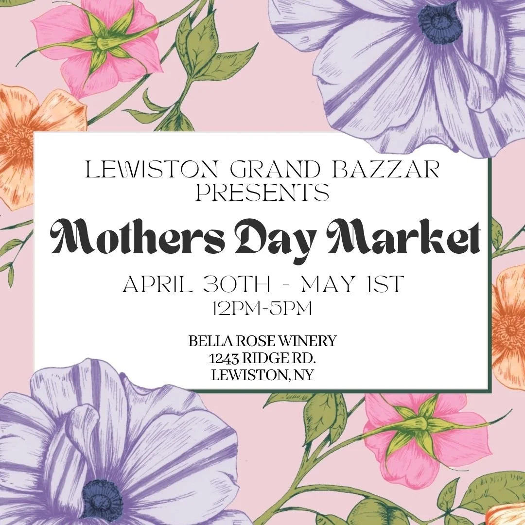 Join us for a Mother’s Day Market at Bella Rose Winery, presented by The Lewiston Grand Bazaar. Grab a of flight wine and shop 40 local artisans on Saturday April 30th and come back Sunday May 1st to shop 40 different local amazing artisans for a 2-day event from 12-5pm both days! Click the below links and follow The Lewiston Grand Bazaar on Facebook and Instagram for more details and full list of vendors.